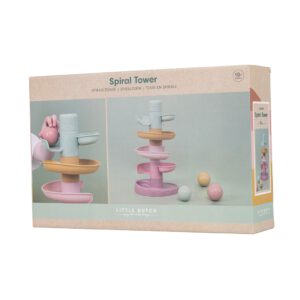Laat de bal maar rollen! De spiraaltoren van Little Dutch zorgt voor eindeloos veel speelplezier. Deze kleurrijke set bestaat uit 5 subtiel gekleurde delen die jouw kleintje gemakkelijk op elkaar stapelt. Laat de ballen een voor een op de bovenste laag vallen en kijk hoe ze achter elkaar naar beneden rollen en slingeren. De spiraaltoren draagt bij aan de ontwikkeling van de hand-oog coördinatie en leert kleintjes over oorzaak en gevolg, waarmee het zowel leuk als leerzaam spelen is. Bij de spiraaltoren zitten standaard 3 lichte en gemakkelijk vast te pakken ballen in verschillende kleuren die bij beweging een geluidje maken. Dit speelgoed is uitgevoerd in de kenmerkende Little Dutch kleuren oudroze, roze, lichtroze, groen en okergeel. De afmeting is: 18 x 18 x 30 cm. Geschikt voor kinderen vanaf 18 maanden.